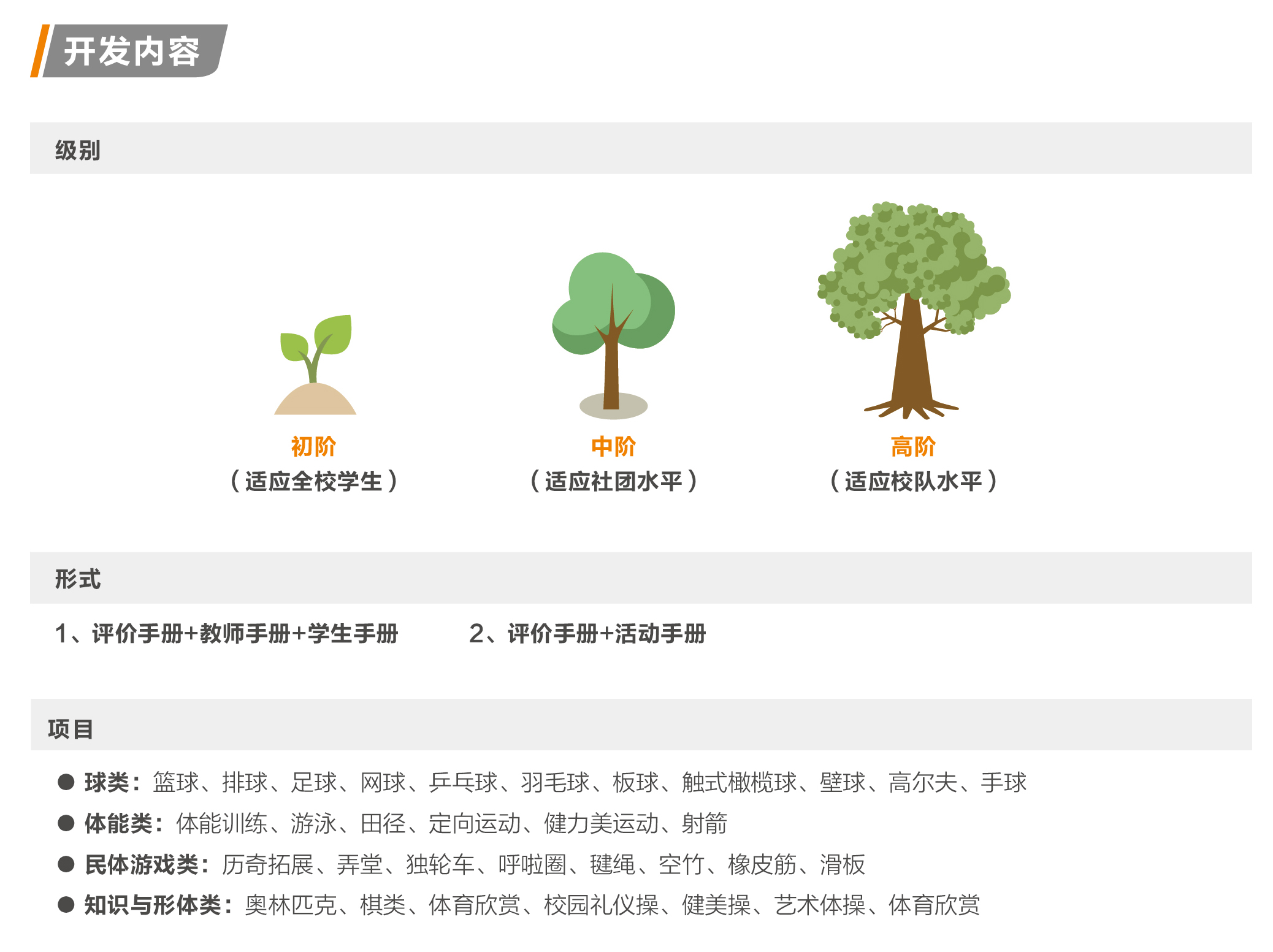 引進(jìn)歐美日先進(jìn)的青少兒體育教育的先進(jìn)理念,根據(jù)中國的具體國情,將專項體育課程分成初、中、高三個等級,并把每個等級的課程細(xì)分成16級,量化的過程化評價,讓孩子們在每一級運(yùn)動技能的掌握上都可以清晰地看到自己的進(jìn)步,以此獲得滿足感和成就感,從而掌握1-2項體育運(yùn)動,并最終養(yǎng)成終身自主運(yùn)動的習(xí)慣。